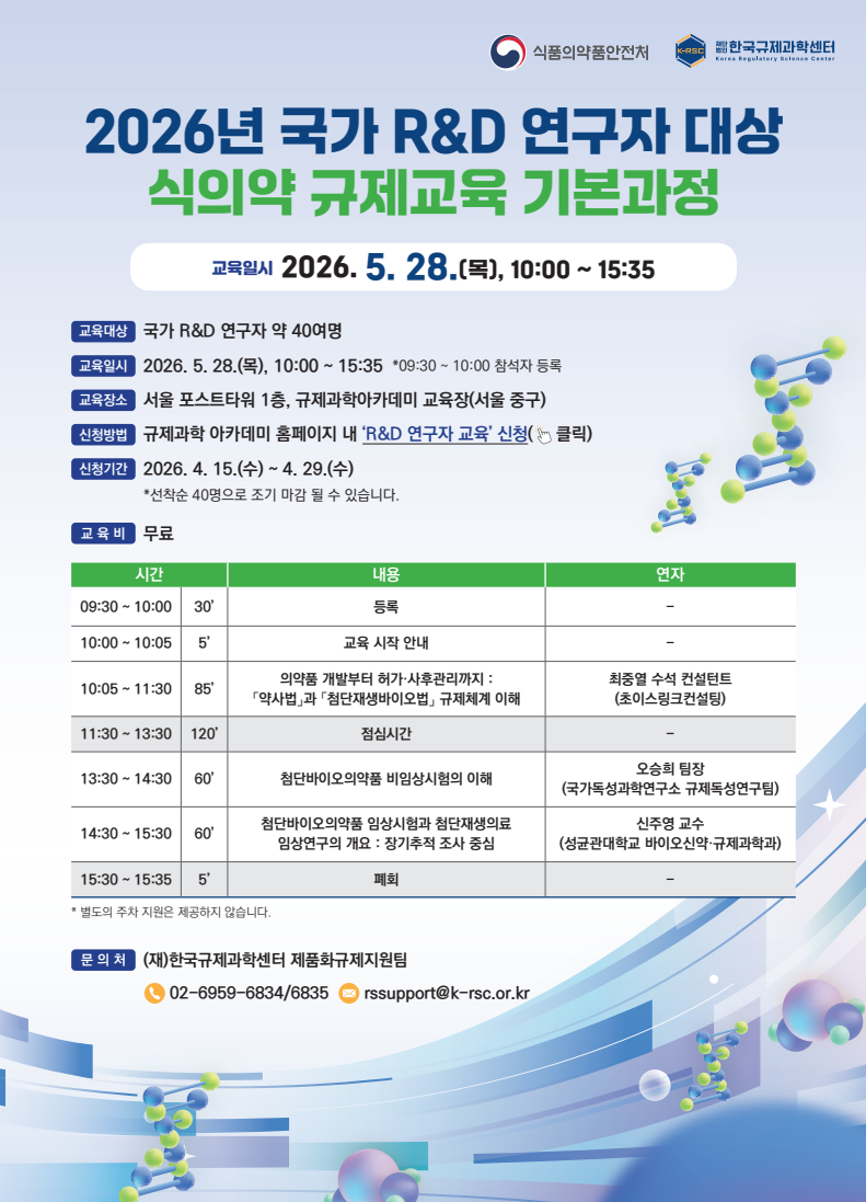 [한국규제과학센터] 2026년 국가 R&D 연구자 대상 식의약 규제교육 기본과정 교육 개최