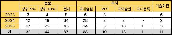 유전자편집제어복원기반기술개발사업 성과 누계 2025-10-23 GERC 0 112 10.23 10:05 *2025. 10. 23. 기준 ※ 상위 10% 이내 논문 성과는 상위 5% 이내 성과 포함※ 국내특허는 PCT 특허 포함