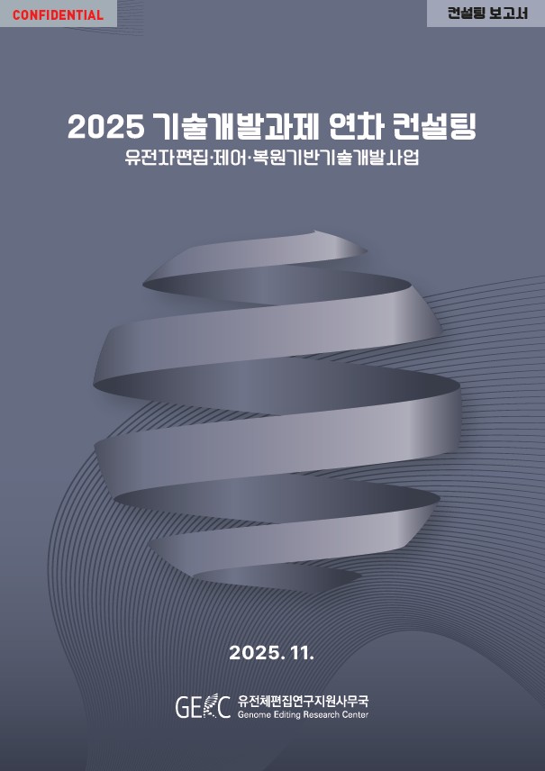 [컨설팅 보고서] 2025 기술개발과제 연차 컨설팅 2025-12-30 GERC 0 48 2025.12.30 09:27 [유전자편집·제어·복원기반기술개발사업] 수행 기술개발과제들에 대한 개별 컨설팅 내용을 포함한, 비공개 자료입니다.* 본 보고서는 과학기술정보통신부에서 시행한 「유전자편집·제어·복원기반기술개발사업」 수행의 일환으로 작성되었습니다.* 본 보고서는 '비공개' 자료이므로 외부 공개를 허용하지 않습니다.* 본 내용은 유전체편집연구지원사무국(GERC)의 의견과 다를 수 있음을 밝힙니다.GERC_2025.12.